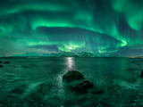 The vivid green Northern Lights dance above Lyngenfjord, the longest fjord in Troms county in Norwa…